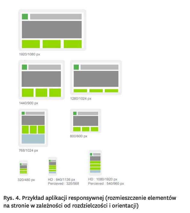 Układ elementów zmienia się w zależności od orientacji ekranu oraz rozdzielczości, co prezentuje rys. 4. Komponenty odpowiednio przeskalowują się, może również nastąpić ich reorganizacja, tak by wykorzystać całe dostępne miejsce, jakie oferuje ekran tabletu, komputera bądź telefonu.