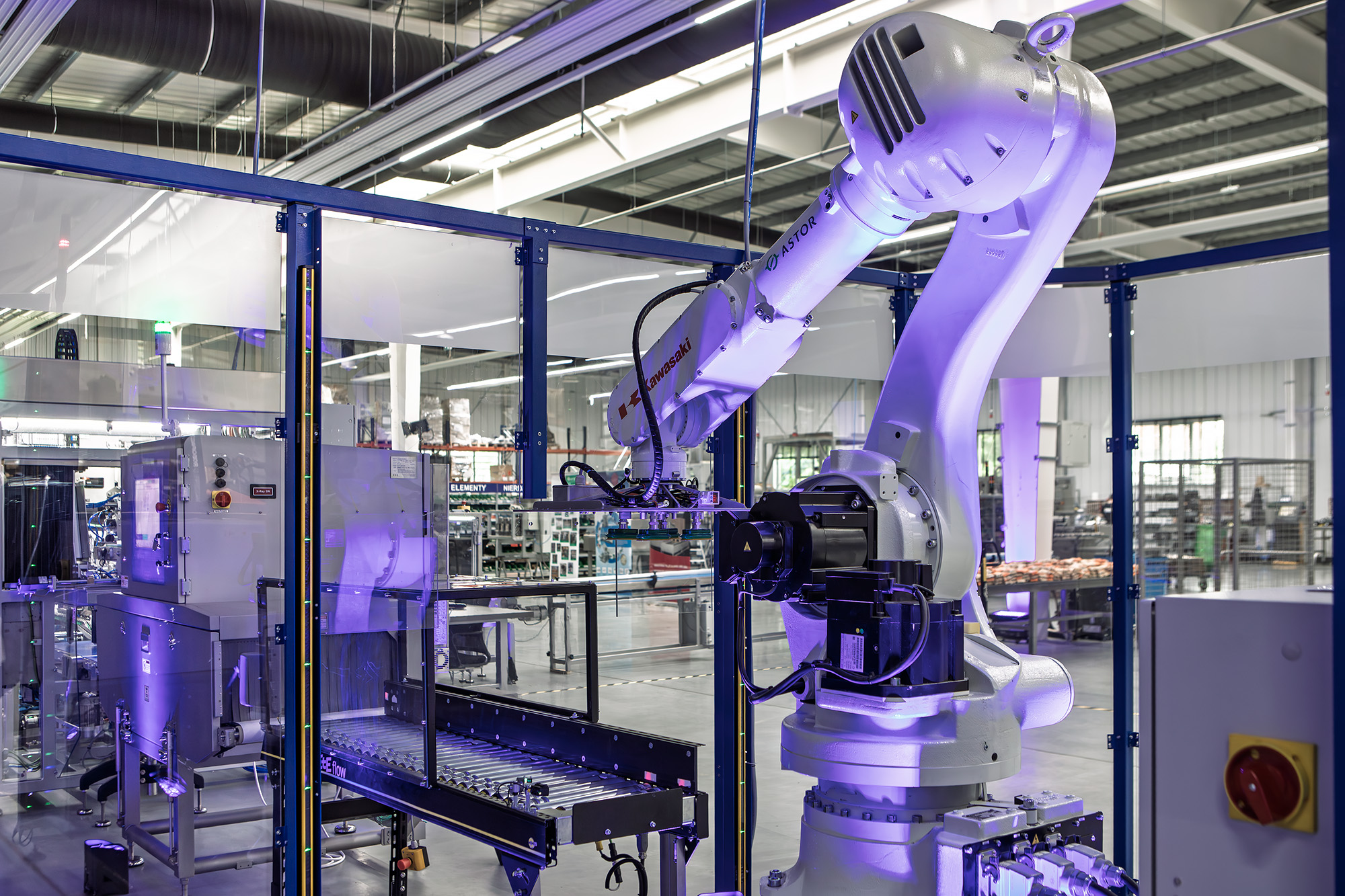 - Zwiększenie wydajności procesu paletyzacji dzięki zrobotyzowanemu stanowisku wyposażonemu w robota Kawasaki i chwytak podciśnieniowy, które paletyzuje kartony szybko i efektywnie, bez przerw podczas wymiany palety.