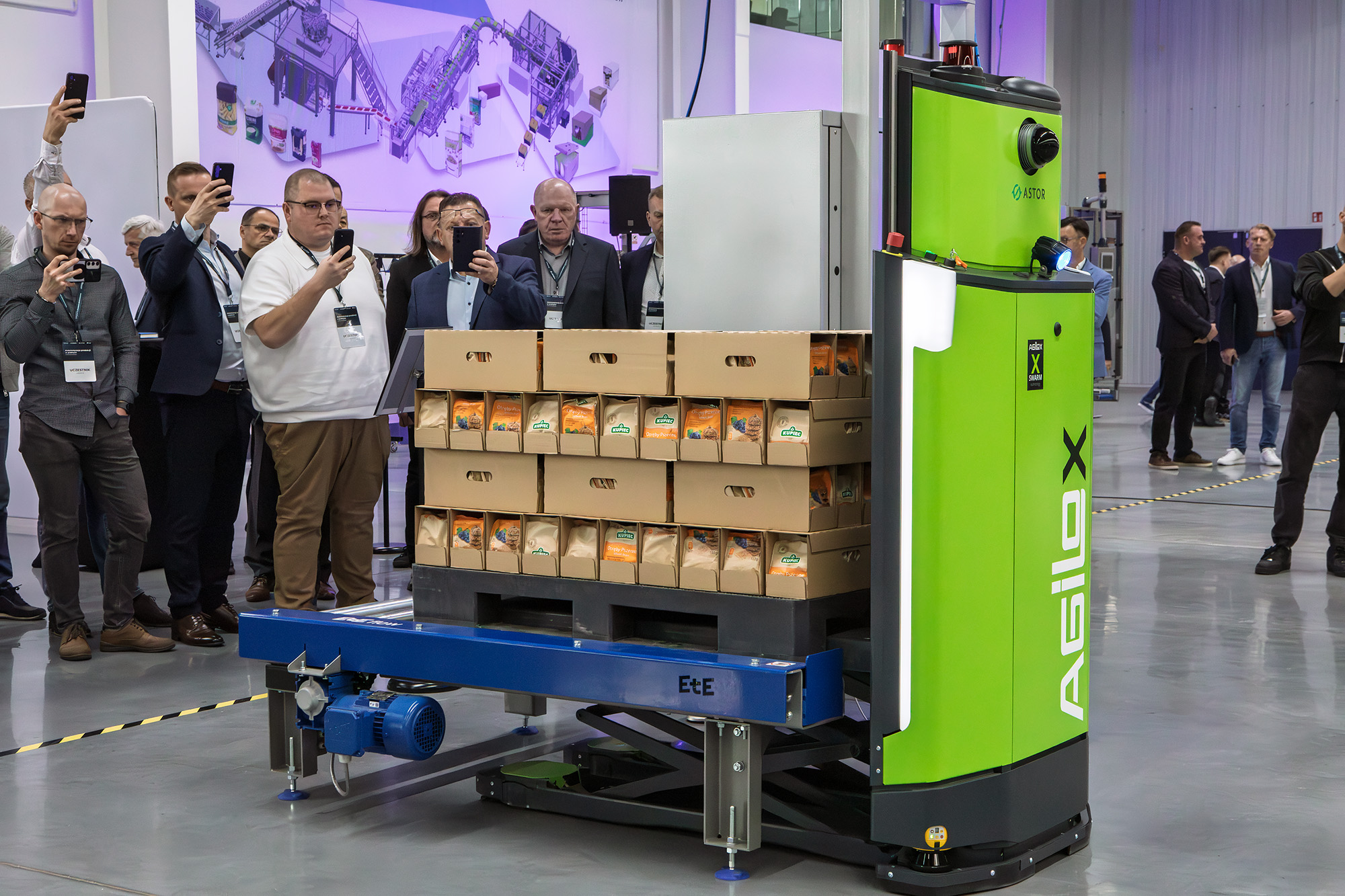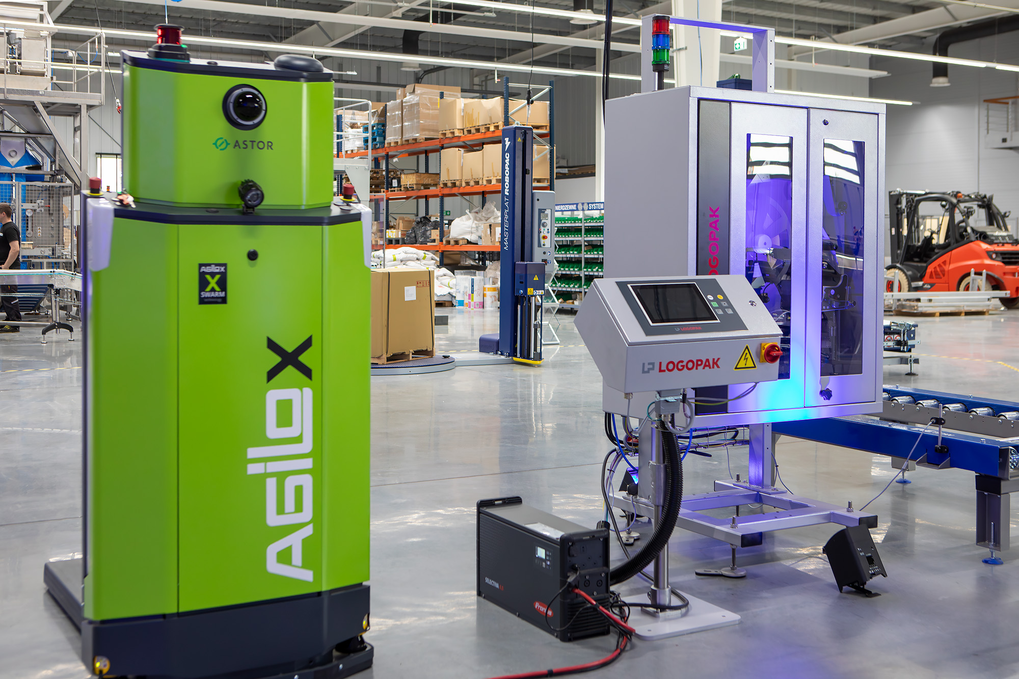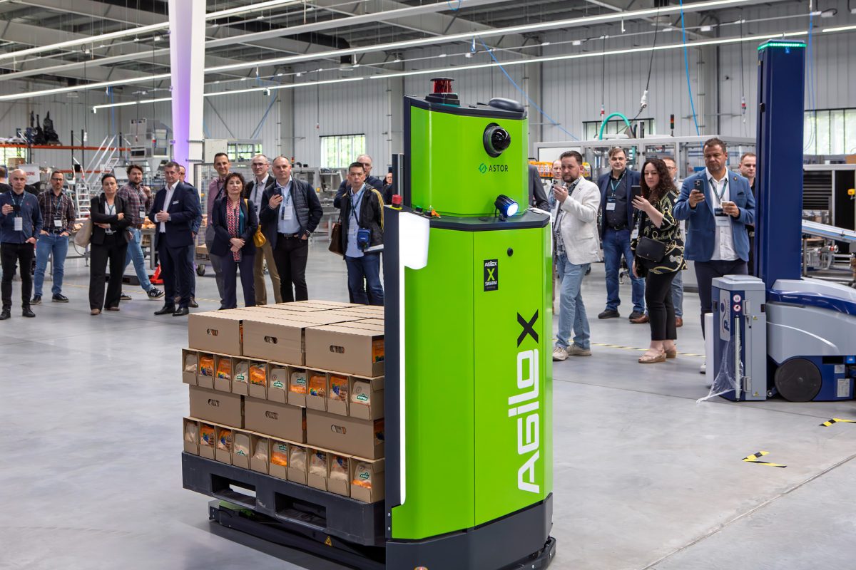 Po utworzeniu palety, kolejnym wyzwaniem jest jej sprawny transport wewnątrz fabryki – do magazynu, innej linii produkcyjnej czy stacji roboczej. Tutaj z pomocą przychodzą roboty mobilne, takie jak AGILOX, które zapewniają zautomatyzowany transport wewnętrzny. Mogą one samodzielnie odbierać palety prosto z miejsca paletyzacji, transportując surowce, opakowania i gotowe produkty.