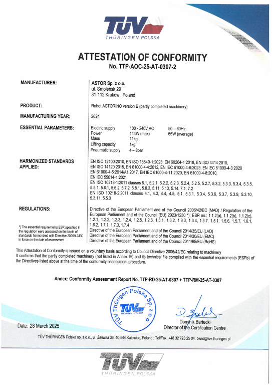 ASTOR, a trusted provider of intelligent technologies for industry in the areas of automation, robotics, industrial IT/artificial intelligence, and intralogistics, as well as the manufacturer of the educational robot Astorino, proudly announces it has obtained the prestigious TÜV safety certificate. This significant achievement, combined with a successful presentation in April at the ongoing World Expo 2025 in Osaka, opens new opportunities for Polish technology on international markets, with particular emphasis on Japan.