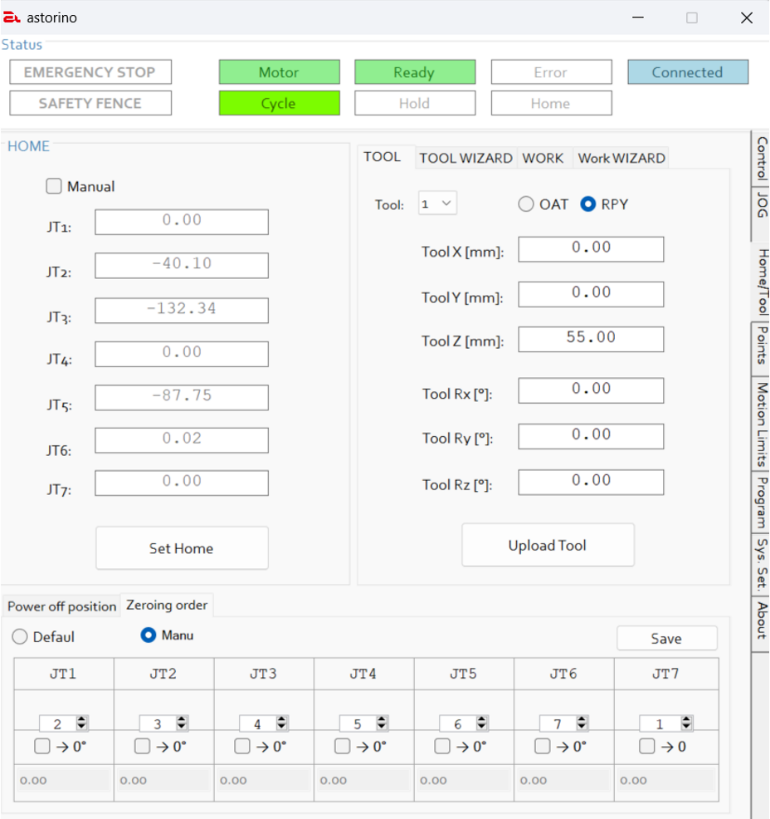 Zaczniemy od ustanowienia punktu początkowego, w którym robot będzie zaczynał program. Domyślnie będzie to pozycja HOME (rys. 4), którą możemy zapisać przy pomocy menu pokazanego poniżej. Należy dojechać w trybie JOG (rys. 3) do zadanej pozycji i nacisnąć Set Home (rys. 4).