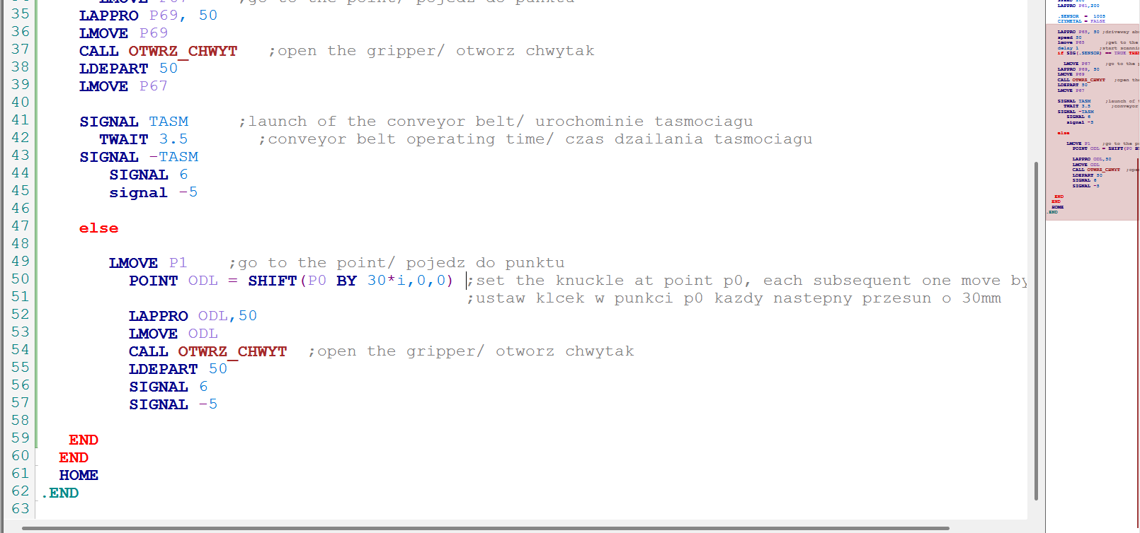 - LDEPART – instrukcja ta powoduje oddalenie się robota od aktualnego punktu o określoną odległość (w tym programie o 50 mm).