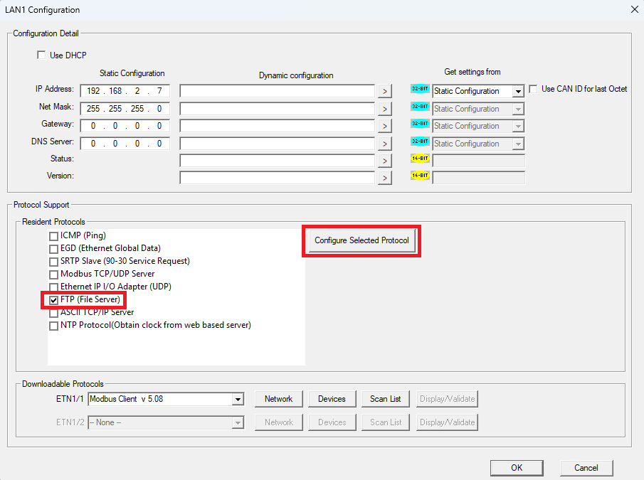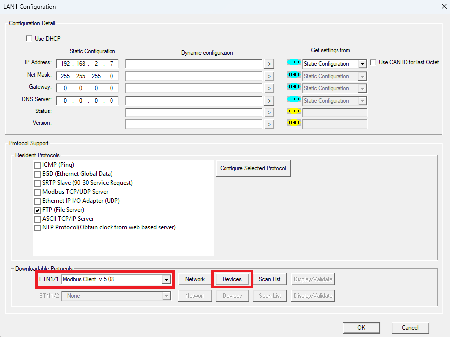 W kolejnym kroku przejdź do Hardware configuration i wybierz opcję Config obok portu LAN1. Ustaw adres IP sterownika jako 192.168.2.7 oraz maskę podsieci jako 255.255.255.0. Następnie przejdź do kategorii Downloadable Protocols i z rozwijanej listy wybierz opcję Modbus Client v 5.08. W tym momencie możliwy będzie wybór trzech nowych opcji: Network, Devices oraz Scan List.