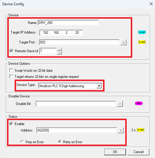 Przejdź do Devices -> Add. Dodaj nazwę urządzenia (np. DRV_260) i wpisz adres IP ustawiony wcześniej na falowniku (192.168.2.20). Zaznacz również opcję Remote Slave Id oraz wpisz ID urządzenia ustawione w falowniku pod parametrem P14.00 (domyślnie: 1). Jako Device type wybierz Modicon PLC 5-Digit Addressing. Opcjonalnie możesz także uaktywnić rejestr statusowy.