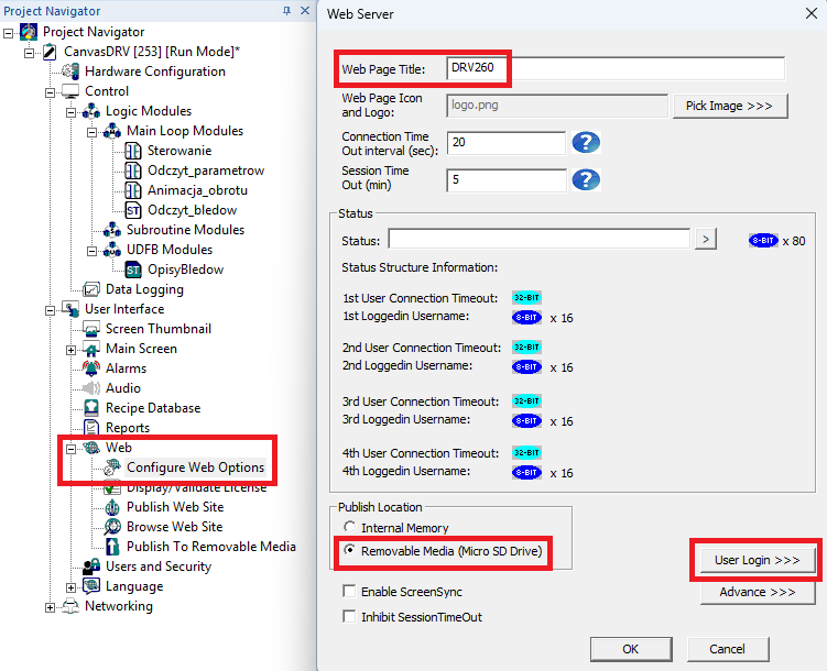 W tym momencie możesz uruchomić przygotowaną stronę internetową, wpisując adres IP sterownika w wyszukiwarce, klikając w opcję Browse Web Site w drzewku projektu lub klikając w opcję Launch Website, znajdującą się w sekcji User Interface.