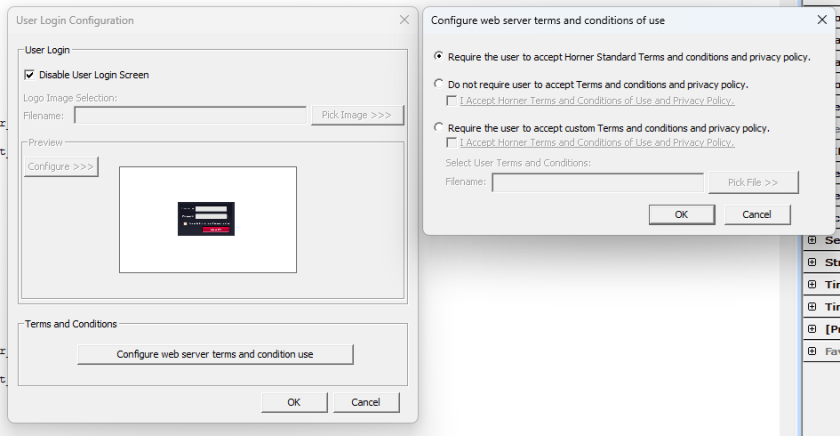 Na koniec przejdź do konfiguracji uprawnień. W sekcji User Login możesz pominąć ekran logowania, zaznaczając opcję Disable User Login Screen, co przyspieszy dostęp do wizualizacji. Masz również możliwość wymuszenia akceptacji regulaminu – standardowego lub własnego.