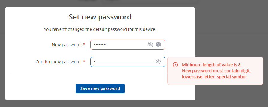 Przy pierwszym logowaniu zmień domyślne hasło. Nowe hasło musi zawierać cyfrę, małą literę oraz symbol specjalny. Zapisz konfigurację przyciskiem Save new password.