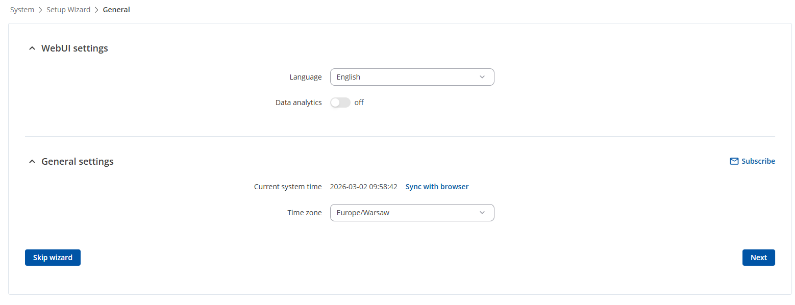 Z listy rozwijanej Time Zone wybierz odpowiednią strefę czasową. W Polsce jest to: Europe/Warsaw. Zsynchronizuj wstępnie czas z czasem komputera naciskając przycisk SYNC WITH BROWSER. Przejdź do następnego kroku przyciskiem NEXT.
