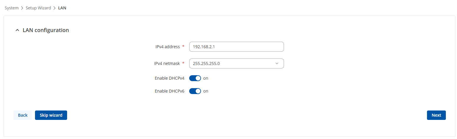 Sprawdź, czy adres IP urządzenia został automatycznie ustawiony na 192.168.2.1, a maska podsieci na 255.255.255.0. Przejdź do następnego kroku przyciskiem NEXT.