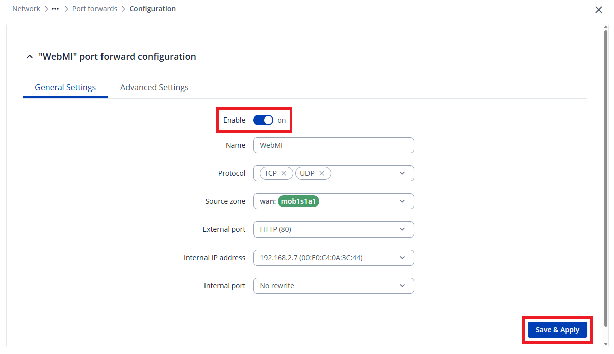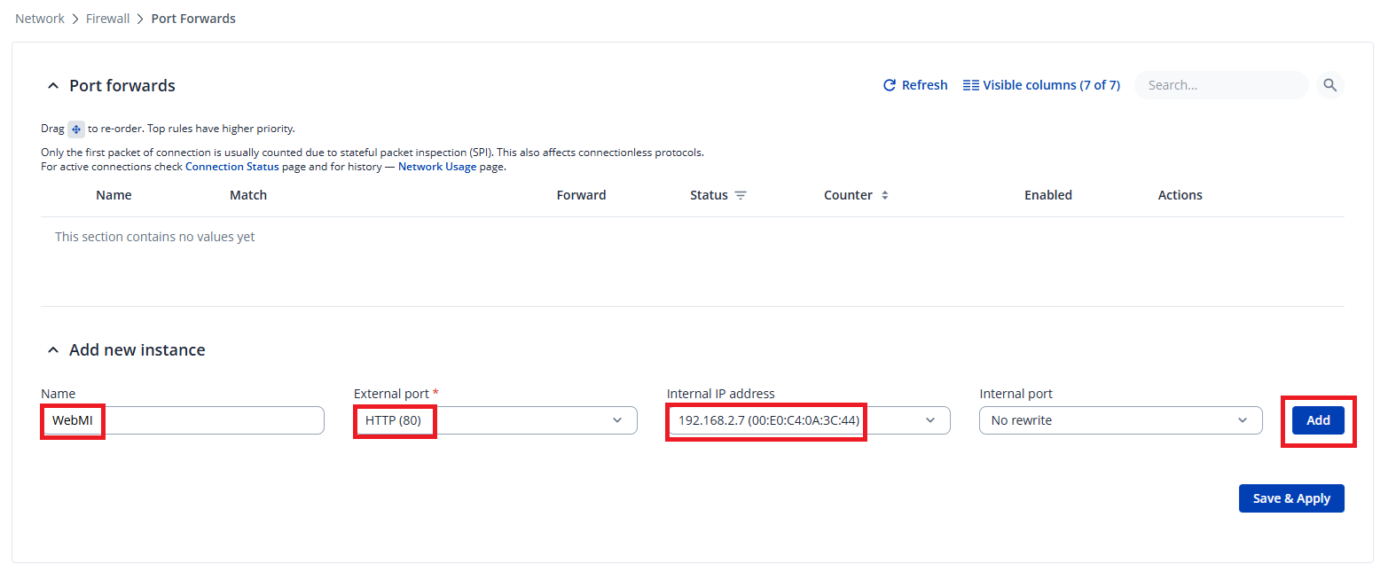 Zdefiniuj nazwę przekierowania jako WebMI, ustaw External port jako 80 (HTTP), następnie Internal IP address jako adres IP sterownika PLC: 192.168.2.7, a pole Internal port pozostaw nieuzupełnione.