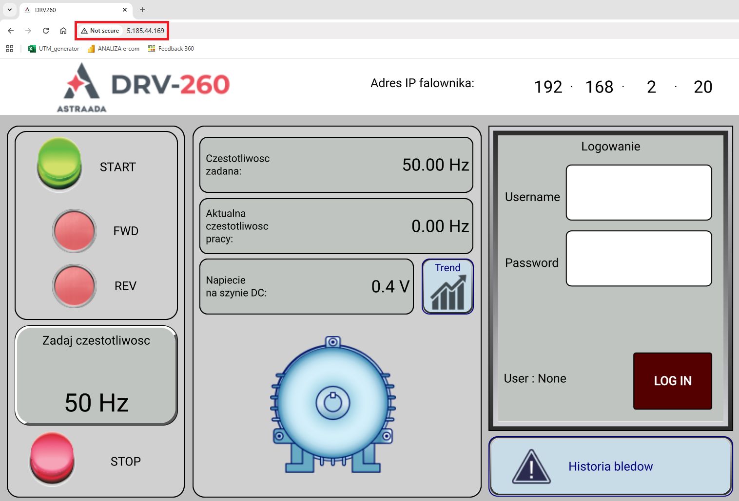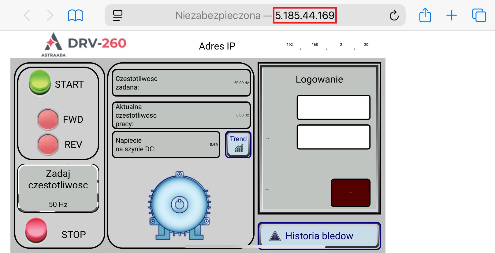 Od tego momentu możliwe jest nawiązanie zdalnego połączenia ze sterownikiem PLC. W tym celu wystarczy wpisać adres IP 5.185.44.169 w przeglądarce na dowolnym urządzeniu z dostępem do Internetu.