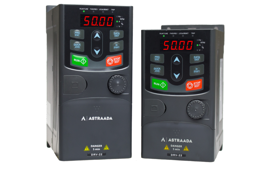 Astraada DRV-22 to seria falowników małej mocy ze sterowaniem skalarnym U/f oraz z bezczujnikowym sterowaniem wektorowym o niewielkich gabarytach i prostym montażu na szynie DIN, jeden obok drugiego.